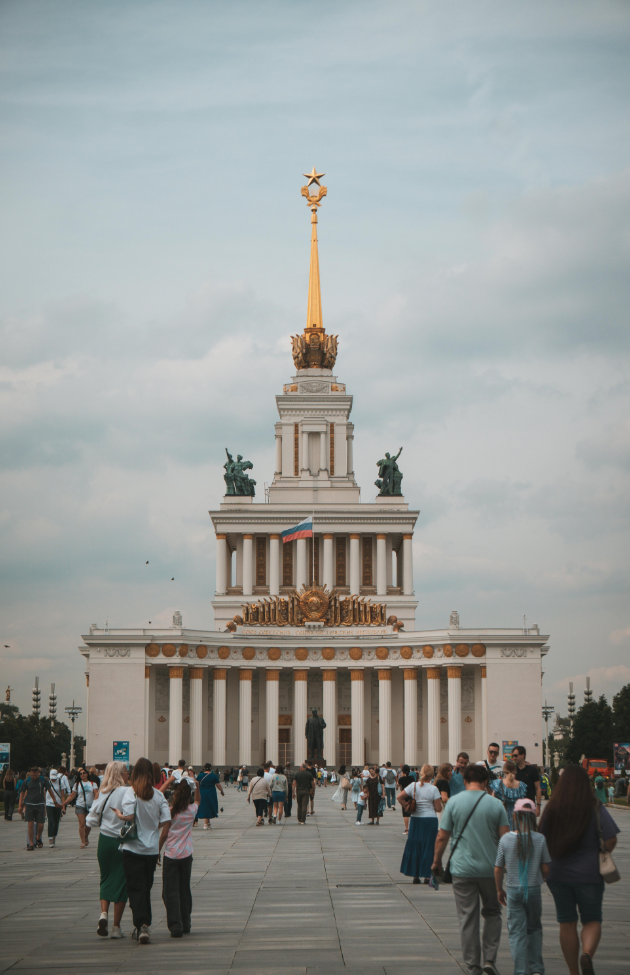 The Central Pavilion at VDNKh, Moscow, is topped with a golden spire featuring the iconic Soviet symbols of a worker and kolkhoz woman, celebrating industry and agriculture in monumental style.